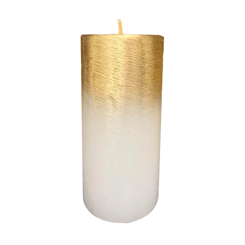 A Vela Cilíndrica 7×15 cm Branca com Ouro possui acabamento lixado e spray dourado, com peso de 530g. A cor ouro é padrão, mas é possível personalizar com spray prata. Entre em contato para personalizações. Perfeita para criar um ambiente elegante e sofisticado em sua decoração.