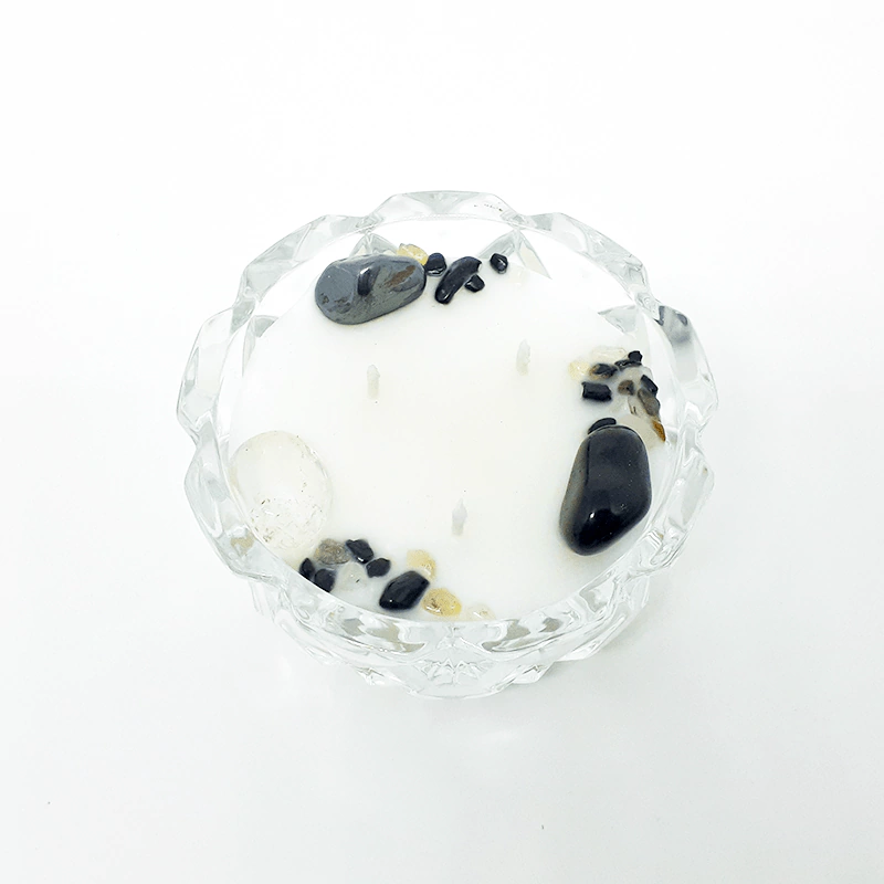 A Vela com Cristais da Proteção perfumada em bowl de vidro vem com essência de Alecrim e cristais energéticos: Quartzo Branco, Hematita, Ônix e Pedrisco Ônix + Quartzo Branco. Com medidas de 11 cm de diâmetro x 5,5 cm de altura, a vela é embalada em uma caixa dura (12x12x6 cm), proporcionando uma fragrância envolvente e energia protetora para o seu ambiente.