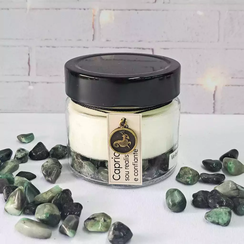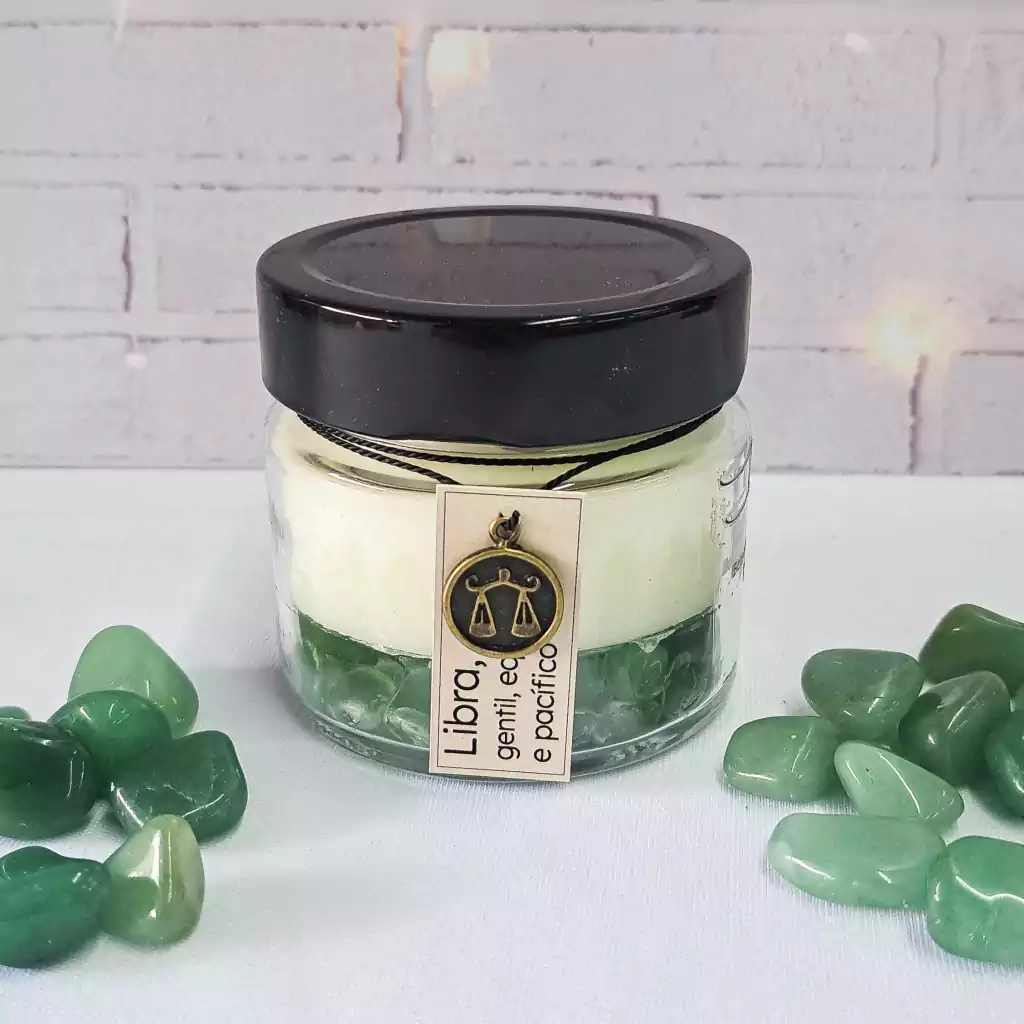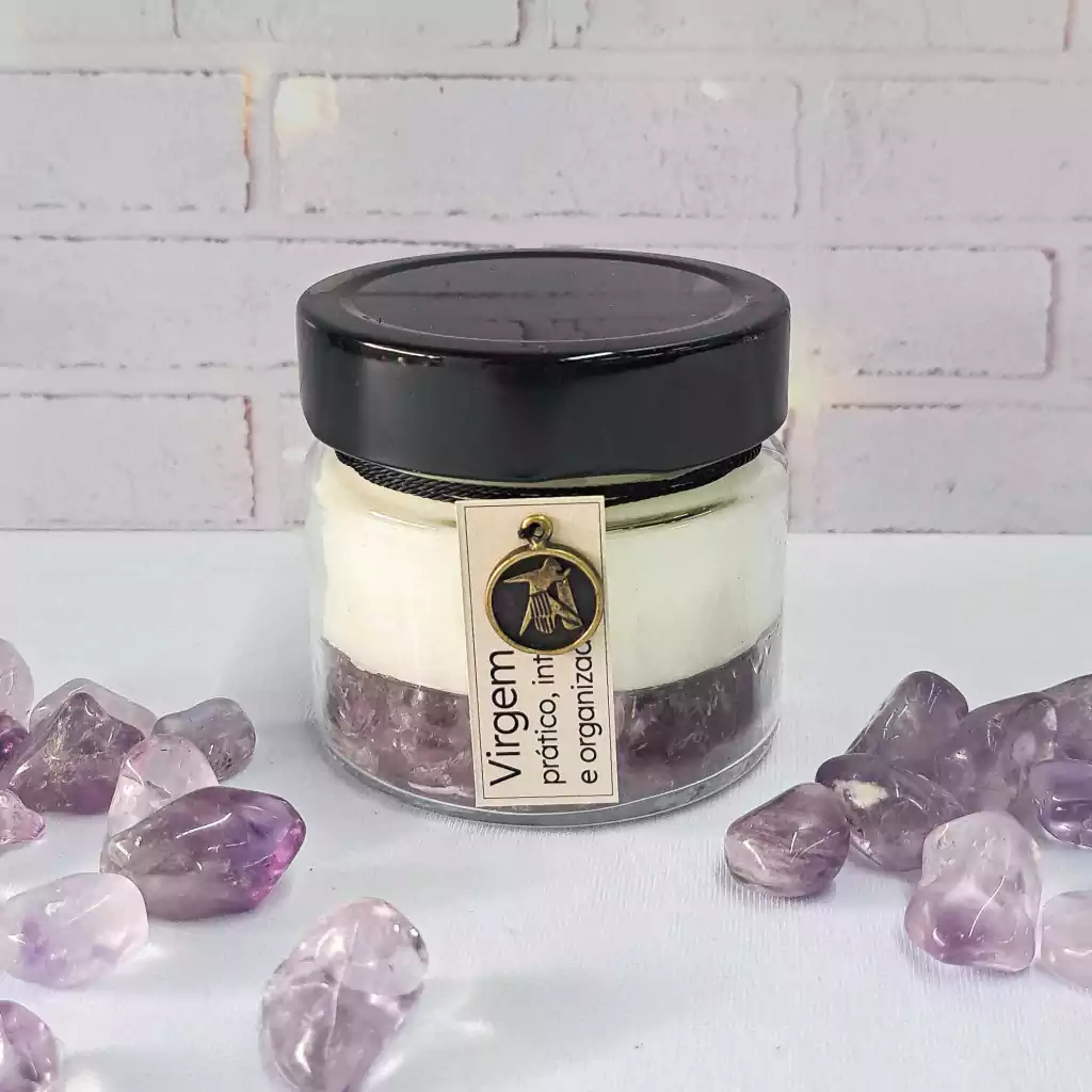 A Vela Perfumada Signos com Cristais vem em pote de 7,5x7cm, com tampa de alumínio preta e cristais em gel, pesando aproximadamente 150g. Ideal para trazer boas energias ao ambiente, cada vela de signo é embalada em um saquinho de algodão cru, oferecendo uma combinação de fragrância envolvente e energias positivas para sua casa ou espaço reservado.
